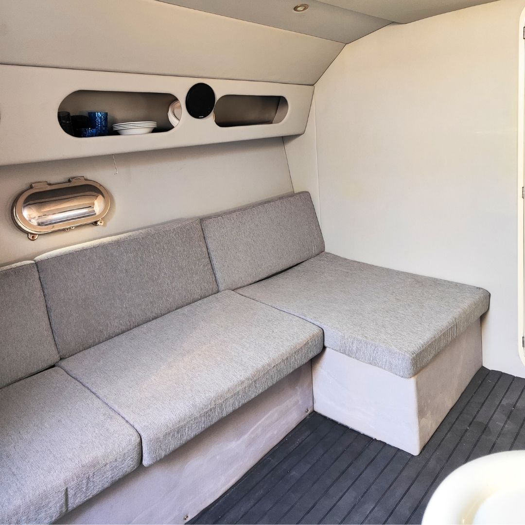 Su bañera alargada, se distribuye en un salón y un camarote con baño en suite.